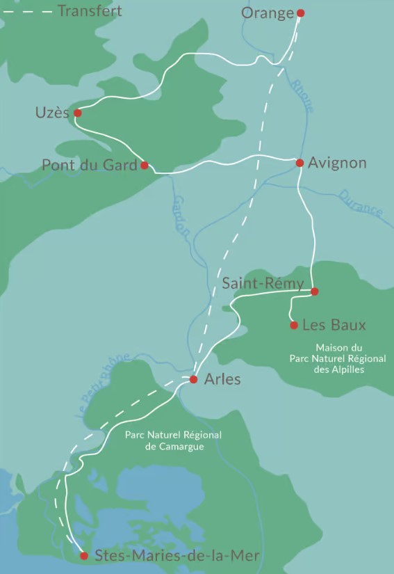 Startpunkt: Orange. Närmaste flygplats är i Marseille och därifrån är det enkelt att ta direkttåg till Orange (cirka 1,5 timme).