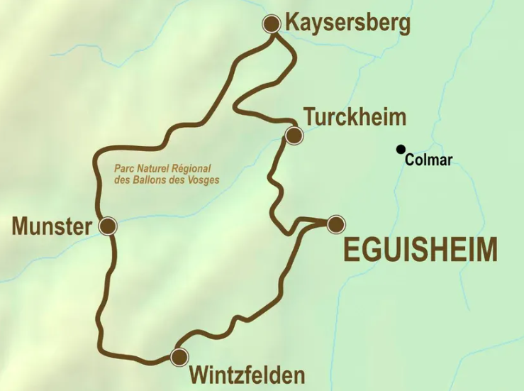 Från Kaysersberg når ni byn Labaroche och toppen av Petit Hohnack (927 m). Efter passet Croix de Wihr (840 m) leder stigen er till Munster, i hjärtat av Vosgesbergen. Denna lilla stad och dess gröna dal är känd för sin ost med samma namn, ett av regionens kulinariska kännetecken.